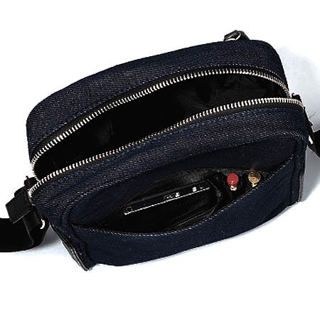デニム生地に牛革を合わせたカジュアルテイストのショルダーバッグ。人ごみの中でも邪魔にならないシンプル&コンパクト設計でありながら、タップリしたマチとふんだんに配されたポケットで収納力は充分です。デジカメに文庫本長財布に携帯電話もスッキリ持ち運べます。